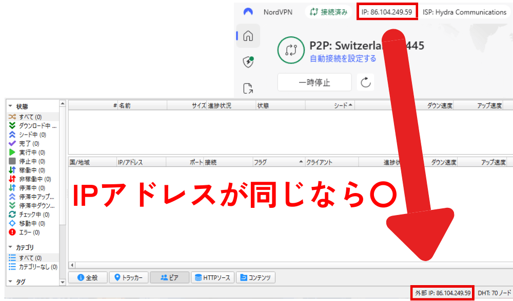 接続が完了したら、qBittorrentを開いて正しく接続できているかチェックしておきましょう。