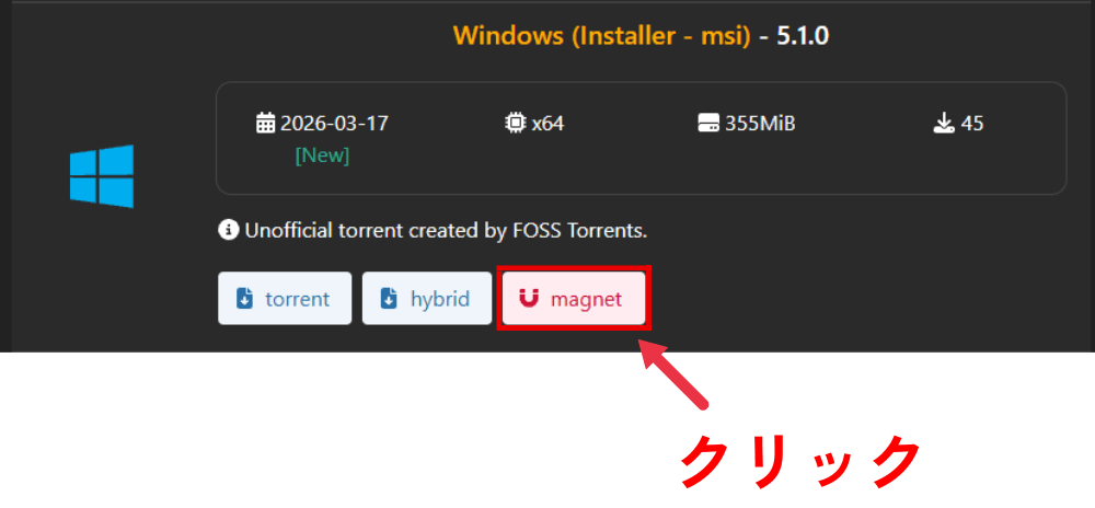 マグネットリンクは、ファイルそのものをダウンロードせずに、「磁石アイコン」をクリックするだけで