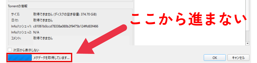 この画面で「メタデータを取得しています…」から動かない場合があります。