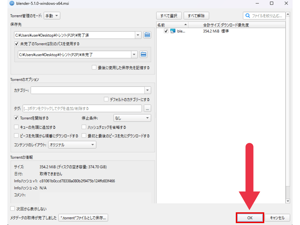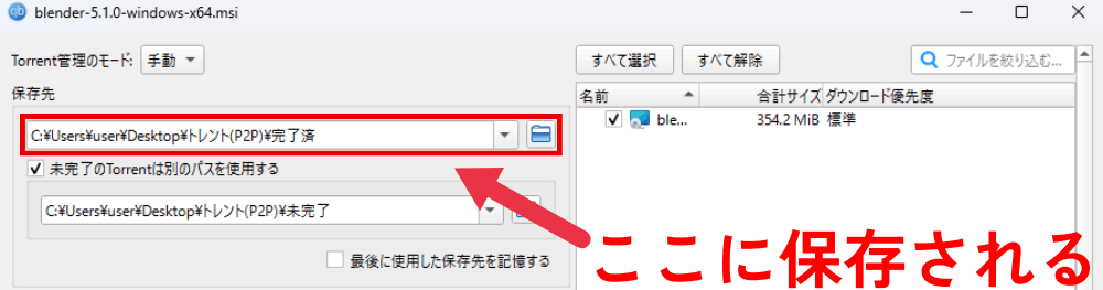 こちらは、一度小さな「設定ファイル(.torrent)」をPCに保存してから、
