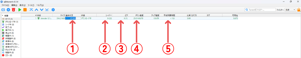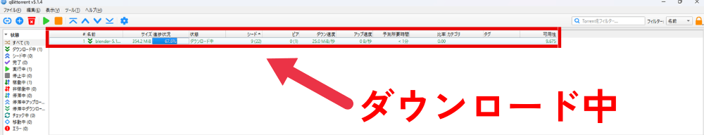 左側の数字が「1以上」なら、誰かと繋がってダウンロードが進んでいる証拠になります。