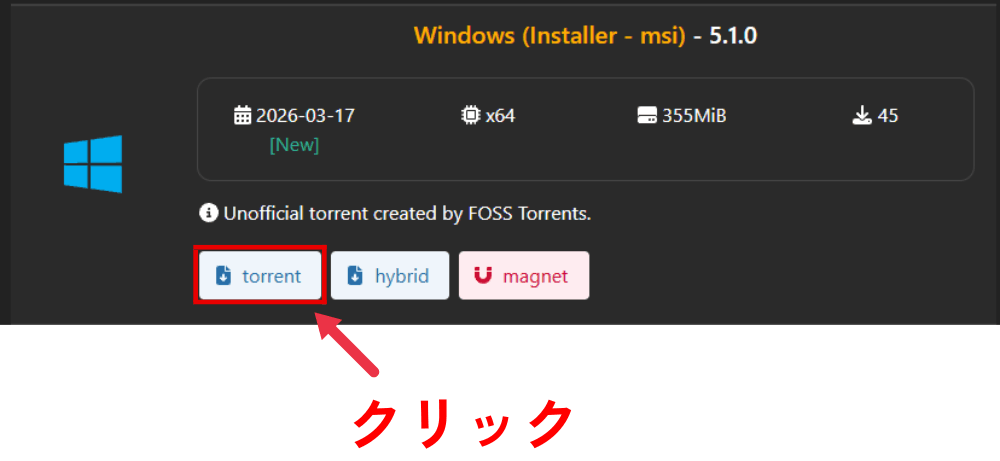 今度は「magnet(マグネット)」ではなく、「torrent(トレント)」のボタンをクリックします。