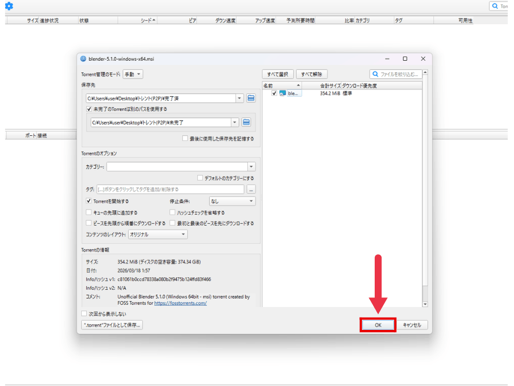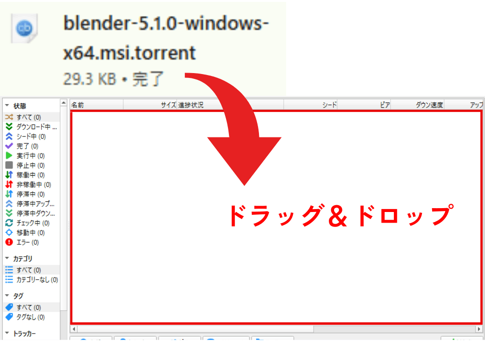 ダウンロードされた「.torrent」のファイルをqBittorrentの画面にドラッグ&ドロップします。