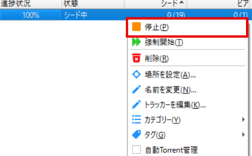 「今は通信を止めたいけど、後でまたシードを再開したい」という場合は「停止」を使いましょう。