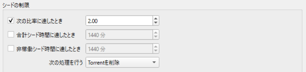 手作業で終了するのが面倒な場合は、設定の『BitTorrent』>『シードの制限』を変更することで、